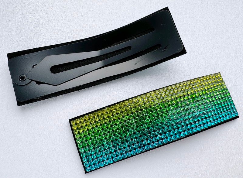 Стильная заколка клик - клак украшена сверкающими термостразами. Длина 8 см , ширина 2,5 см. Цена за 1 шт.