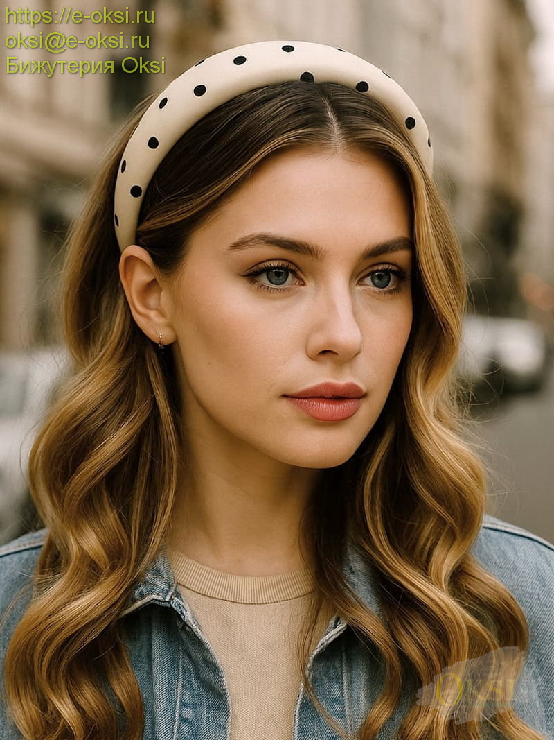 Очаровательный ободок в горошек, молочного оттенка.Универсальный, этот цвет подойдет к основным оттенкам одежды. Обязательно пригодится на каждый день или вечер, разбавит и освежит любой скучный наряд. Лёгкий, удобный и комфортный, не жмёт и не давит голову.