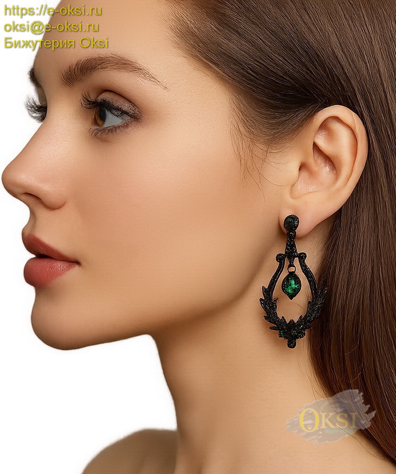 Эффектные, лёгкие ажурные серьги инкрустированы очень красивыми изумрудно - зелеными кристаллами. Длина серьги 5,5 см. Качественное покрытие черненым родием.